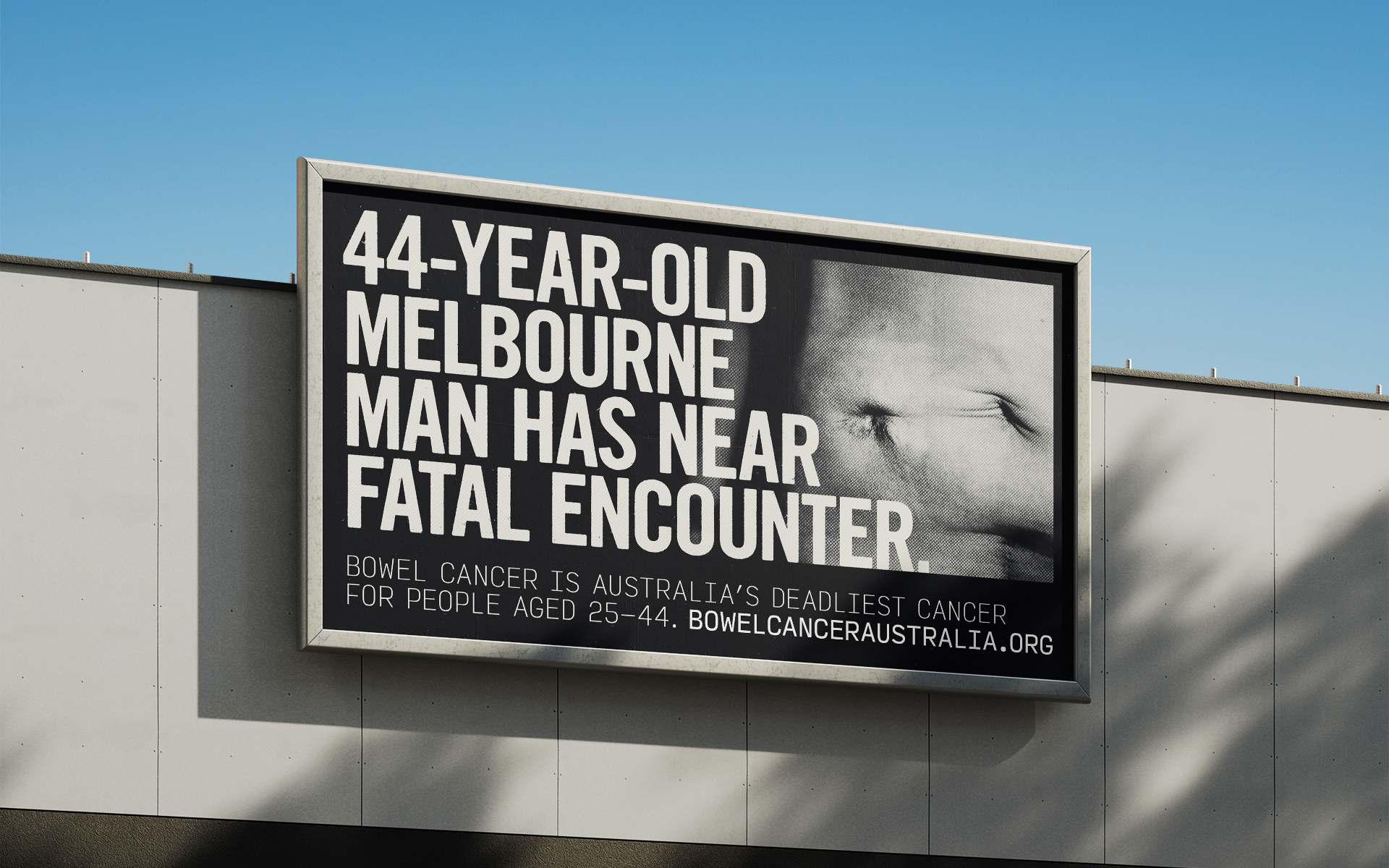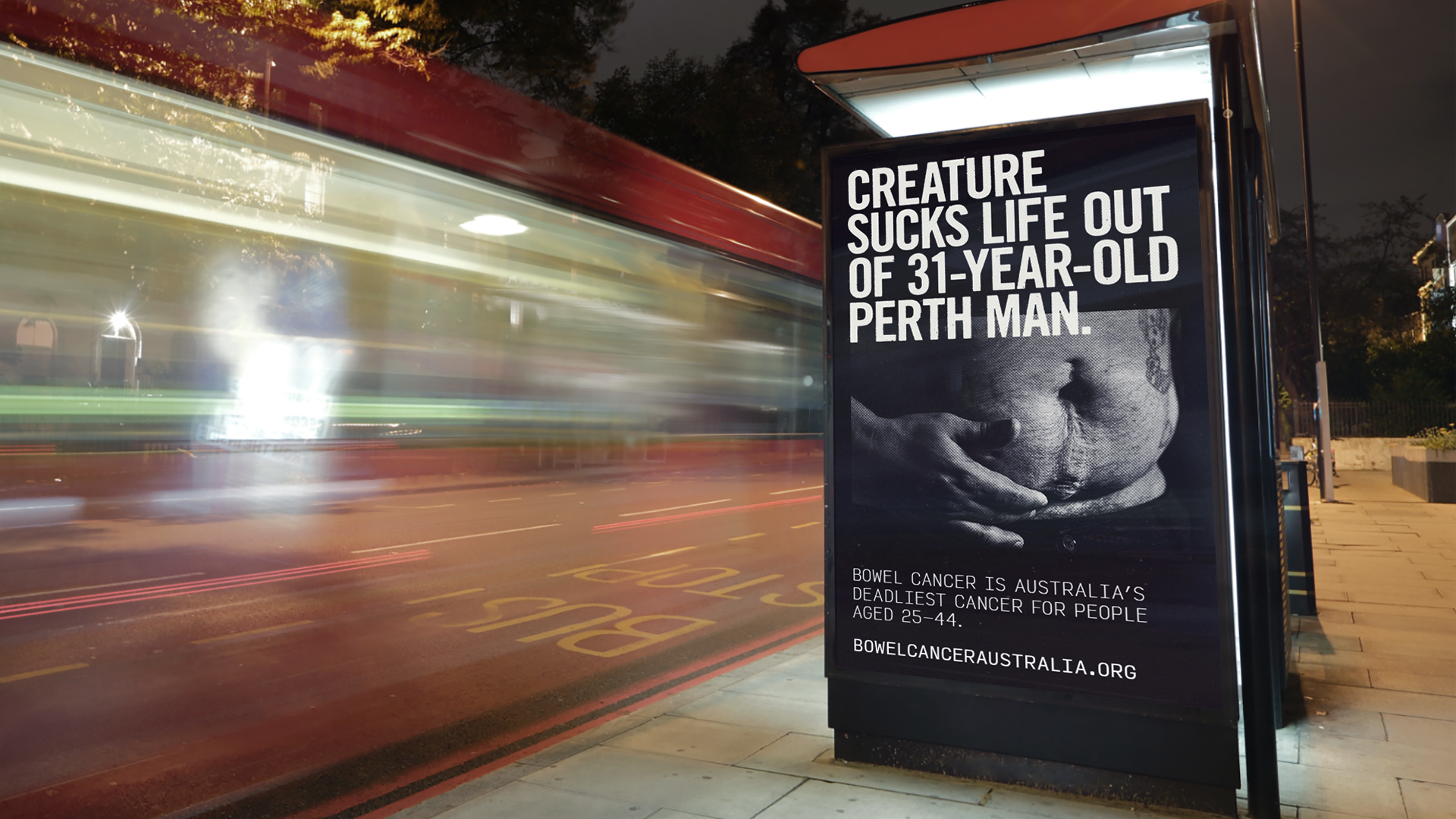 How do you shoot down the falsehood that bowel cancer is an old person’s disease? You shock. So, in a country full of deadly creatures, we introduced bowel cancer as worst of the lot and, darkly, one that preys on 25-44 year olds